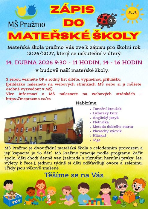Mateřská škola pražmo Vás zve k zápisu pro školní rok 2026/2027, který se uskuteční v úterý 14. dubna 2026 9:30 - 11:00, 14:00 - 16:00 v budově naší mateřské školy.
